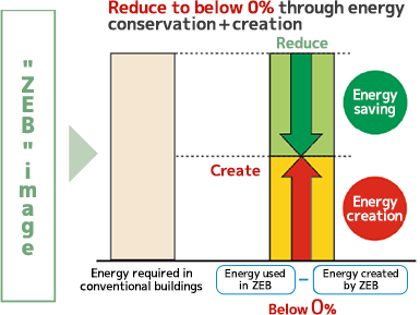 The building has achieved ZEB certification by saving approximately 50% of its energy through the introduction of high-efficiency air conditioning equipment and switching to LED lighting, and by creating approximately 50% of its energy through solar power generation.
