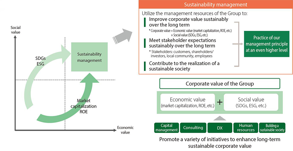 The Group will enhance our economic and social value and increase our corporate value on a long-term sustainable basis by promoting sustainability management, which we position as “practice of our management principle at an even higher level,” and by promoting specific initiatives to realize a sustainable society.