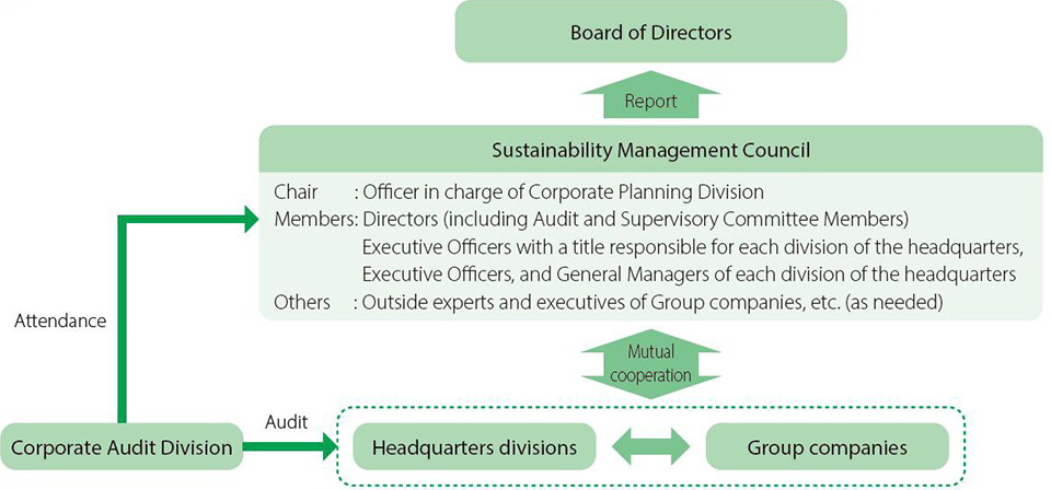 Matters discussed by the Sustainability Management Council are reported to the Board of Directors on a regular basis or as needed.