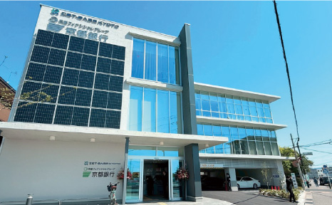 2025年4月にJR向日町駅前に新築した京都フィナンシャルグループMUKOUビルは、BELSの最高ランクである「6つ星」と一次エネルギー消費量をゼロもしくはマイナスにする『ZEB』を取得しました。ビルの1・2階は京都銀行の営業店舗、3階は脱炭素関連スタートアップ向けのインキュベーション施設(京都府へ貸与)となっています。