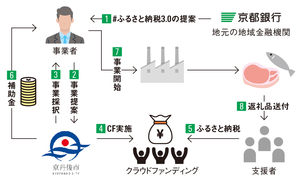 地場産品の創出と企業誘致による地域経済の活性化を目指して、京丹後市等と連携し、ふるさと納税型クラウドファンディング「#ふるさと納税 3.0」を推進しています。同市は、海と山に囲まれた自然豊かな環境にあり、ブランドガニである間人ガニや琴引メロンなど魅力的な食資源を有する一方、少量多品種生産が主流で、地場産品の供給量が少ないなど課題があります。これに対し、同市での事業に意欲を持つ市外事業者や商品開発に意欲的な市内事業者を対象に本事業の活用を提案し、企業誘致を含む潜在的な事業者の掘り起こし等を行っています。