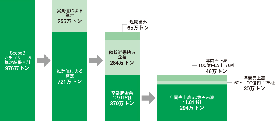 当社グループのカテゴリー15排出量の976万トンは、実測値による算定(一次データ利用)255万トンおよび推計値による算定(二次データ利用)721万トンに分解されます。このうち、京都府内に本社を持つ企業の排出量は実測値による算定(一次データ利用)42万トン(約100社)、推計値による算定(二次データ利用)370万トン(約12,000社)となります。
